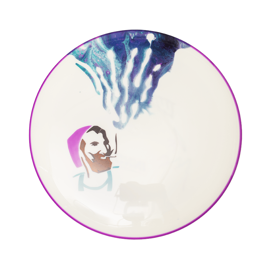 "Smoke" was created by stenciling the man first then clear glueing the entire disc everywhere but where I wanted the smoke and finally dipping a floetrol dye for the colorful smoke.